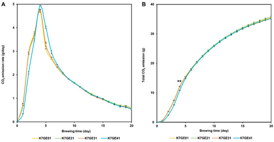 Carbon dioxide (CO2) emissions of genome-edited sake strains. Daily (A) and total (B) CO2 emissions measured by weight. K7GE01 (yellow), K7GE21 (green), K7GE31 (orange), and K7GE41 (blue) were examined. Error bars indicate standard error (n = 3).** indicates a peak of CO2 emission rate (day 4).