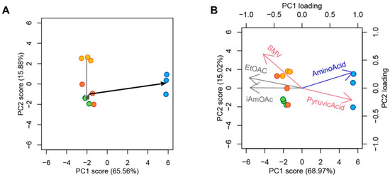 Principal component analysis (PCA) of sake produced by genome-edited yeast strains. Distribution of genome-edited yeast strains in the PC1–PC2 orthogonal space after performing PCA with 19 components (A). K7GE01 (yellow), K7GE21 (green), K7GE31 (orange), and K7GE41 (blue) were generated in that order. Distribution of sake components in the PC1–PC2 space after performing PCA with 16 components (without the three intentionally changed components) (B). Pyruvate and sake meter value (SMV) (red), ethyl acetate and isoamyl acetate (grey), and amino acidity (blue) are shown as arrows.