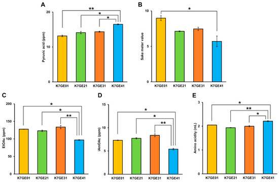 The results deduced from the PCA mentioned above were confirmed by direct statistical comparison of the individual components. Considering the fermentation-related components, sake made from K7GE41 had significantly higher pyruvate (Tukey’s multiple comparison test, p < 0.01; Figure 6A) and significantly lower SMV (p < 0.05; Figure 6B) than did sake made from K7GE01. Aroma components such as ethyl acetate and isoamyl acetate were significantly decreased in sake made from K7GE41 (p < 0.05; Figure 6C,D). Amino acidity significantly increased in sake made from K7GE41 (p < 0.05; Figure 6E). In Supplementary Materials Figures S3 and S4, we summarized other components that unexpectedly changed for K7GE41. Compared with the 14 components that changed during the breeding of K7GE41, fewer changes were observed in other breeding processes. When car1∆/car1∆ was introduced into K7GE01 to make K7GE21, only four components (isoamyl alcohol, 1-propanol, succinic acid, and lactic acid) were changed significantly and unintentionally (p < 0.05; Supplementary Materials Figure S4). No unexpected components were changed during the breeding of K7GE31. Ethanol, acidity, and malic acid did not change during the serial breeding steps (Supplementary Materials Figure S1). Thus, many components changed unintentionally during the serial breeding of these sake yeast strains.