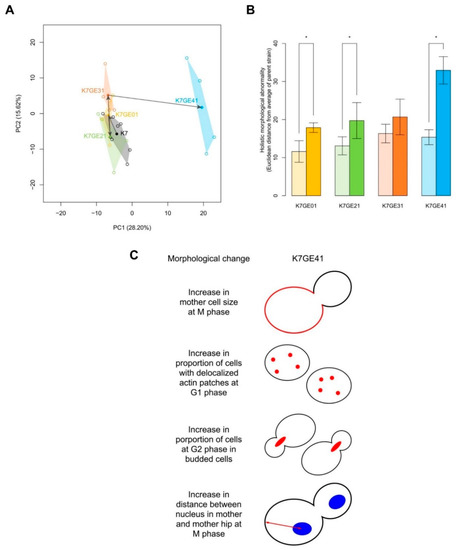 Morphological changes during serial breeding. (A) Distribution of sake yeast isolates in the orthogonal morphological space. Principal component analysis was performed on 501 morphological traits of four genome editing strains. K7GE01, K7GE21, K7GE31, and K7GE41 (n = 4 each, open circles) and the standard K7 strain (n = 7, open black circles). The colors of the strain names and regions are the same as in Figure 1. The first two PCs (PC1 x-axis, PC2 y-axis) captured 43.82% of the variance, as shown in parentheses. The center of each strain was calculated as the average of the PC score and is shown as a solid circle. Arrows indicate the direction of breeding. (B) Euclidean distances from their parental strain. The holistic morphological abnormality was calculated as the Euclidean distance of each replicate from the center of the parental strain in the orthogonal morphological space of the 11 PCs capturing 90% of the variance of the 501 traits. Light and vivid colors indicate the parent strains and genome-editing strains K7GE01, K7GE21, K7GE31, and K7GE41, respectively. The error bar indicates the standard deviation. An asterisk indicates a significant difference at p < 0.05 after the Bonferroni correction (likelihood ratio test of one-way ANOVA with a gamma distribution). (C) Schematic representation of the morphological features of the genome-edited sake yeast strains. One-way ANOVA of the generalized linear model was applied to 501 morphological traits of five sake yeast strains, and 31 traits were detected at p < 0.05 after the Bonferroni correction. Of the 31 traits, 23 in at least one genome editing strain differed significantly from K7 at p < 0.05 by the Wald test. K7GE01, K7GE21, K7GE31, and K7GE41 differed significantly from K7 in 4, 3, 9, and 17 traits, respectively. The 23 detected morphological traits were summarized by successive PCA with 114 replicates of BY4743 and are illustrated.