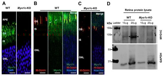 MYO1C localizes to photoreceptors in mouse retina. Eyes from adult wild-type (WT) and Myo1c-KO mice (n = 8 mice per genotype; 50:50 male–female ratio) were harvested, and retina sections (n = 5–7 sections per eye) were immunostained with an anti-MYO1C antibody (A–C) and M-opsin antibody (B,C), followed by secondary (Alexa 488 or Alexa 594) antibody staining. MYO1C (green fluorescence), M-Opsin (red fluorescence), and DAPI or Hoechst (blue fluorescence). Figures in (A–C) are representative of retinal sections (n = 5–7 sections per eye) imaged from n = 8 animals per genotype. (B,C) Merge (orange) represents co-localization of MYO1C-488 (green) with M-Opsin-594 (red). White arrows in B show cones. RPE, retinal pigmented epithelium; OS, outer segments; IS, inner segments; ONL, outer nuclear layer. (A–C) Scale bar = 50 µm. (D) Total proteins isolated from WT (n = 4) and Myo1c-KO (n = 4) mouse retinas were pooled sequentially and subjected to SDS-PAGE. Two different concentrations of protein (10 μg and 20 μg) were used. Blots were then probed with anti-Myo1c and Gapdh antibodies. Western blot analysis were repeated thrice. Arrows indicate MYO1C protein band in retinal lysates of WT mice.