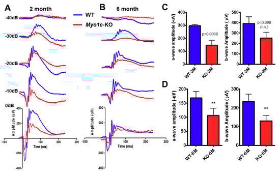 Immunofluorescence analysis showed that MYO1C was enriched in the rod photoreceptor outer (OS) and inner segments (IS) (Figure 1A), as well as in the cone photoreceptor OS of wild-type (WT) mice (Figure 1B), but it was absent in the photoreceptors of Myo1c-KO animals (Figure 1A,C). Western blot analysis further confirmed that MYO1C protein was absent in the retinas of Myo1c-KO mice (Figure 1D). Since mutations or deletion of the motor protein, MYO7A, were associated with retinal degeneration in Usher syndrome and its animal model, we were prompted to investigate the effect of Myo1c in retinal function. Using electroretinograms (ERGs) [46,47], we tested photoreceptor cell function of Myo1c-KO and WT mice (n = 8 mice per genotype and age-group; 50:50 male–female ratio) under dark-adapted scotopic conditions. In contrast to WT animals, we observed reduced ERGs for Myo1c-KO mice at different ages. Two-month-old Myo1c-KO mice showed a significant reduction in the a-wave amplitudes, but not in b-wave amplitudes (p < 0.0068 and p < 0.098, respectively) (Figure 2A,C). Strikingly, ERG analysis of adult six-month-old Myo1c-KO mice showed loss of retinal function, in which a significant reduction in both a- and b-waves was observed (38-45% lower than WT animals (** p < 0.005; Figure 2B,D).