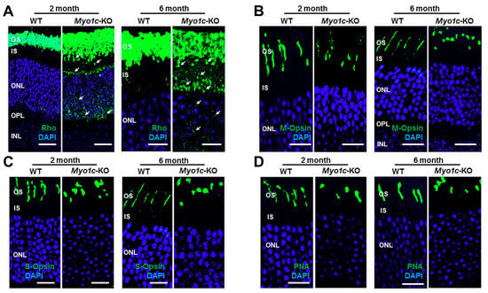 Since the phototransduction protein rhodopsin constitutes 85–90% of photoreceptor OS protein content [48,49], and as the ERG responses were impaired in Myo1c-KO mice, we hypothesized that the loss of MYO1C might have affected proper opsin localization to the photoreceptor OS. To test this hypothesis, we analysed retinal sections from WT and Myo1c-KO mice (at 2 and 6 months of age; 5–7 retinal sections per eye from n = 8 mice per genotype and age-group; 50:50 male–female ratio), probing for rhodopsin, two types of cone opsins, medium wavelength R/G opsin (M-opsin) and short wavelength S-opsin, rod-specific phosphodiesterase 6b (Pde6b), rod-specific CNGA1, rod arrestin (ARR1), rod transducin (G-protein), and the general cone marker PNA lectin. In WT mice at 2 and 6 months of age, rhodopsin localized exclusively to the rod OS (Figure 3A). While the majority of rhodopsin trafficked to the OS in two-month-old Myo1c-KO mouse retinas, some mislocalization to the base of the rod IS and the cell bodies in the outer nuclear layer (ONL) was noted (Figure 3A; white arrows; rhodopsin levels within individual retinal layers were quantified and shown in Figure S3A–C). This suggested incomplete opsin localization to photoreceptor OS in the absence of MYO1C. An even more severe mislocalization of rhodopsin to the rod IS and within the ONL was observed in the 6-month-old Myo1c-KO mice, suggesting a progressive retinal phenotype in the absence of MYO1C (Figure 3A; rhodopsin expression within individual retinal layers were quantified and shown in Figure S3D,E). Staining for the two cone opsins showed that the cone OS were shorter and mis-shaped by two months, and this abnormality increased by six months of age (Figure 3B,C). Retinas stained for PNA lectin showed progressively shorter and mis-shaped cone OS, indicating that the cone OS structure was compromised in the absence of MYO1C as these mice aged (Figure 3D). Cone visual arrestin in WT mice retina typically outlines the entire cell, OS, IS, cell body, axon, and cone pedicle. Staining for cone arrestin in Myo1c-KO animals (2 months of age) confirmed the short and mis-shaped appearance of the cone OS compared to WT retinas at similar ages (Figure 4A, white arrows). In our case, this antibody did not reveal staining to other cone structures, except for the cone OS, so we could not distinguish changes (if any) in cone IS, cell body, axon, or pedicle among WT and Myo1c-KO animals. By contrast, staining for Pde6b, a lipidated rod-specific protein that traffics to the OS independently of rhodopsin [2], showed normal localization to the rod OS in both WT and Myo1c-KO retinas at 2 months of age (Figure 4B).