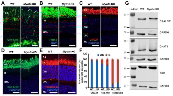 Immunohistochemical analysis of protein localization in photoreceptors of wild-type (WT) and Myo1c-knockout mice retinas: Levels and localization of (A) cone arrestin (ARR), (B) Pde6b; (C) CNGA1; (D) rod Arrestin (ARR1); and (E) G-protein (transducin) were analysed in WT and Myo1c-KO mice retinas to evaluate proper protein localization to photoreceptor OS. Red Arrows in panel A highlight cone photoreceptor nuclei and OS in WT mouse retinas that were significantly reduced or shorter, respectively, in Myo1c-KO animals (white arrows in A). Images in panels A–E are representative of immunostained retinal sections (n = 5–7 sections per eye) imaged from n = 8 animals per genotype and age group (50:50 male–female ratio). Panels (A,B), mice were 2–3 months of age. Panels C–E, mice were 3–4 months of age. (F) Protein distribution (in %) of CNGA1, rod ARR1, and transducin within the photoreceptor OS and IS in light-adapted mice. For quantification of protein distribution within retinal layers, 5–7 retinal sections from each eye (n = 8 animals for each genotype) were analysed using Image J. (G) Representative Western blot (n = 3 repeats) images of retinal proteins from 3–4-month-old WT and Myo1c-KO mice (n = 2 animals per genotype) showed no significant differences in protein expression of key retinal genes among genotypes. OS, outer segments; IS, inner segments; ONL, outer nuclear layer; INL, inner nuclear layer; OPL, outer plexiform layer; IPL, inner plexiform layer.