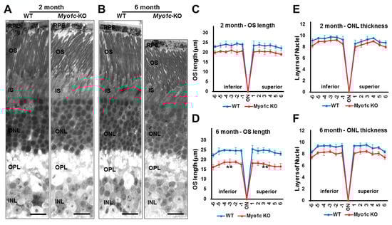 To further evaluate if rhodopsin mislocalization was associated with structural changes to the retina, histological and transmission electron microscopy (TEM) analyses of retinal sections of young and adult WT and Myo1c-KO mice were performed. In histological sections of retinas (5–7 retinal sections per eye from n = 8 mice per genotype and age), the progressive shortening of rod photoreceptor OS was observed. The OS of adult Myo1c-KO mice at 6 months of age were shorter than the OS of Myo1c-KO mice at 2 months of age, which in turn were shorter than those in WT mice at similar ages (Figure 5A,B; OS lengths quantified from H&E sections and represented using spider-plots in Figure 5C,D; ** p < 0.05). In comparison to WT mice, the photoreceptors in Myo1c-KO mice were less organized, especially in the 6-month-old mice (Figure 5B), suggesting that loss of MYO1C may progressively affect photoreceptor homeostasis. The retina outer nuclear layer (ONL) thickness between genotypes at both ages revealed no significant reduction in nuclear layers in Myo1c-KO animals compared to WT mice (ONL thickness quantified from H&E stained sections and represented using spider-plots in Figure 5E,F).