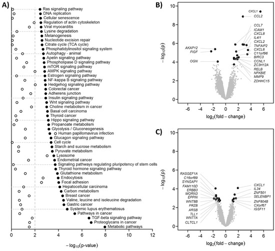 Gene expression profiling. huFib were stimulated with 500 ng/mL C0-C1f, 500 ng/mL C0-Linker for 24h. As controls (Ctrl) unstimulated huFib were harvested. Total mRNA was isolated and microarray analyses performed. (A) Statistical significances of the KEGG pathway analyses as −log10(p). The 50 pathways with lowest p-values in C0-C1f vs. control were selected. The vertical dashed line indicates p = 0.01. Black dots: C0-C1f vs. control, open circles: C0-linker vs. control. (B,C) Volcano plots for C0-C1f vs. control and C0-linker vs. control, respectively. The 20 genes with the lowest p-values are annotated.