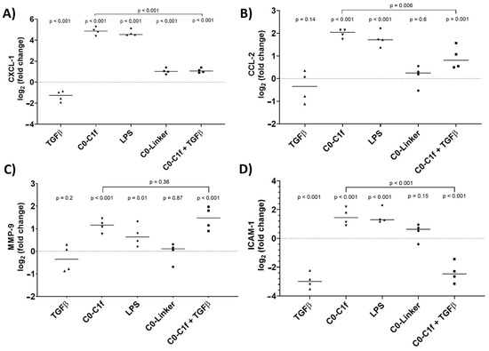 Activation of fibroblasts. huFib cells were treated with 1 µg/mL LPS, 500 ng/mL C0-Linker, or 500 ng/mL C0-C1f and/or 10 ng/mL TGFβ. (A) CXCL-1 (B) CCL-2 (C) MMP-9, and (D) ICAM-1 mRNA abundance was detected by qPCR after 24 h treatment. Data are displayed as individual data points and means; p-values above each condition refer to differences between means (horizontal lines) and 0 fold change (unstimulated controls) unless otherwise indicated. (n = 4; n represents biological replicates).