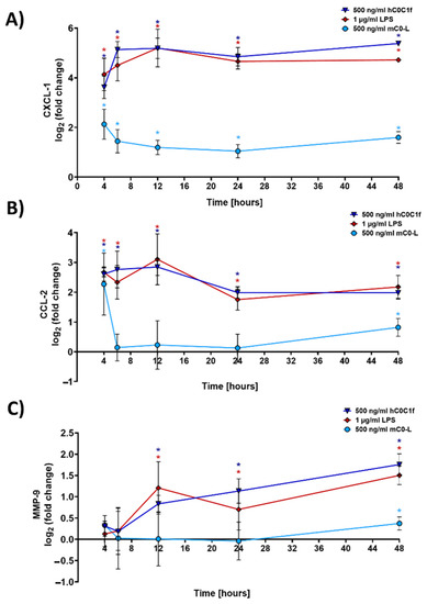 Time-dependent response of fibroblasts. huFib cells were treated with 500 ng/mL C0-C1f, 500 ng/mL C0-Linker or 1 µg/mL LPS for different time periods, and (A) CXCL-1, (B) CCL-2, and (C) MMP-9 mRNA abundance was quantified by qPCR. Data are displayed as mean ± SD (n = 4 biologically independent experiments). * above each condition refer to differences between means (data points) and 0 fold change (unstimulated controls). * p < 0.05 was considered statistically significant.