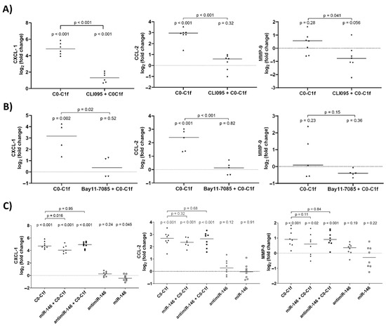 Effects of TLR4 and NFκB inhibition on C0C1f signaling. (A) huFib cells were pretreated for 18 h with CLI-095 (TLR4 inhibitor) and then stimulated with 500 ng/mL C0-C1f for 6 h. mRNA levels of CXCL-1, CCL-2, and MMP-9 were determined by qPCR and compared using an unpaired t-test. (B) huFib cells were pretreated for 18 h with Bay11-7085 (NFκB inhibitor) and stimulated with C0-C1f for 6 h. mRNA levels of CXCL-1, CCL-2, and MMP-9 were determined by qPCR. (C) huFib cells were transiently transfected with 25 pmol miR-146 or antimiR-146 oligos for 24 h prior to C0-C1f treatment for 6 h. CXCL-1, CCL-2, and MMP-9 mRNA were detected by qPCR. In all panels p-values above each condition refer to differences between means (horizontal lines) and 0 fold change (unstimulated controls) unless otherwise indicated. (A) CXCL1 n = 6; CCL2 and MMP9 n = 7; (B) CXCL-1 n = 4, CCL2 and MMP9 n = 5; (C) n = 8; n represents biological replicates.