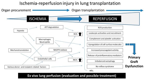 In IRI, the process of reperfusion of the graft, not ischemia per se, plays a more important role in causing injury (Figure 1) [,]. The consequences of IRI are diverse, including generation of ROS, activation/recruitment of leukocytes, activation of complements and platelets, upregulation of cell surface molecules, increased procoagulant activity, and release of various proinflammatory mediators such as cytokines and damage-associated molecular patterns []. These reactions are considerably increased in the lung after reperfusion.
