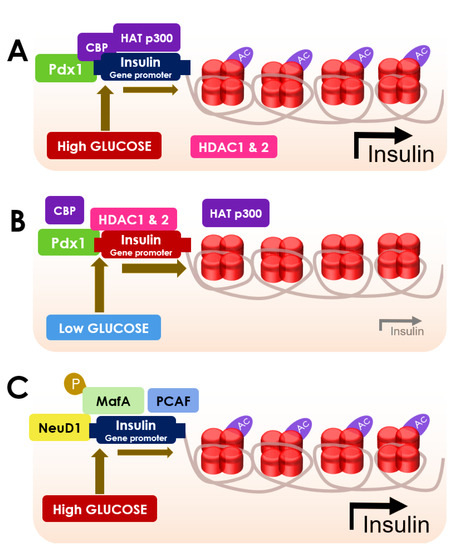 Pdx1 is known to endorse glucose-provoked insulin gene activation [93]. In hyperglycemic conditions, Pdx1 can recruit p300 and triggers the acetylation of H4 protein [93] (Figure 2). The hyperacetylation of H4 at the proximal promoter region causes the hypertrophy of β cells, which subsequently sets off the transcription of preproinsulin in the insulin promoter region to produce high levels of insulin [45]. High glucose can also trigger the acetylation of H4 at the GLUT2 promoter region [45]. Pdx1 recruits HDAC1 and HDAC2 to the insulin promoter in the hypoglycemic condition, which apprehends H4 acetylation and led to the shutdown of insulin production [93] (Figure 2).
