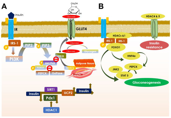 The regulation of glucose metabolism is largely controlled by post-translational modifications of histones [117]. Acetylation and deacetylation of histone proteins are governed by HATs and HDACs, which are the key players to control gene expressions [117]. HDACs can epigenetically regulate fatty acid and carbohydrate metabolism by regulating the transcription of several genes [17]. Classical HDACs can also influence the deacetylation of non-histone protein, signal transducer, and activator of transcription 3 (STAT3), which results in the suppression of gluconeogenic enzyme expression [17]. Kimura et al. reported that classical HDAC inhibitors can suppress hepatic gluconeogenic enzymes via ER stress inhibition mediated through Janus kinase 2 (JAK2)/STAT3-dependent pathway [118]. Hence, HDACs are the key factors in regulating hepatic gluconeogenesis (Figure 3A,B).