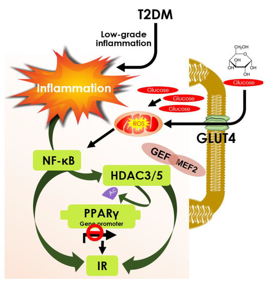 Schematic diagram showing the role of HDAC3 and 5 in PPARγ deacetylation and insulin resistance. Low-grade inflammation in T2DM and Glucose uptake by GLUT4 that produces ROS collectively activates NF-κB function. It modulates HDAC3/5 to deacetylate PPARγ and inactivate its function that contributes to insulin resistance; however, it can be overcome by HDAC3/5 inhibition. GLUT4 Enhancer Factor (GEF) interaction with MEF2A and HDAC3/5 regulates GLUT4 promoter activity acquiring insulin resistance; however, inhibition of HDAC3/5 can increase GLUT 4 expression and prevent insulin resistance.