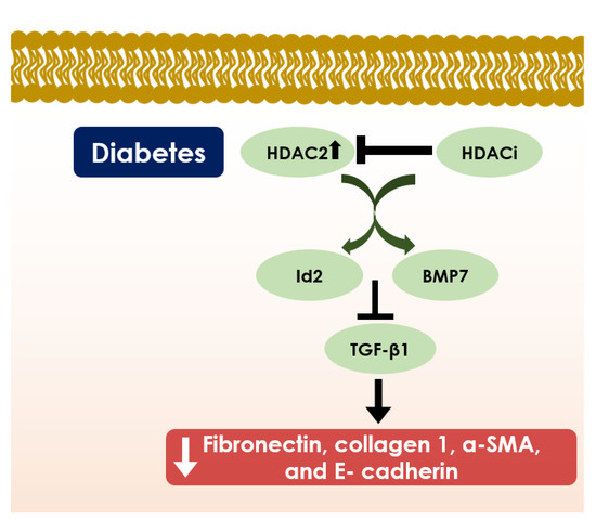 Schematic diagram showing the role of HDACs in diabetic nephropathy. HDAC2 inhibition by HDACi induces expression of DNA binding/differentiation 2 (Id2) and bone-morphogenic protein 7 (BMP7) that represses downstream TGF-β1 signalling and subsequently declines fibronectin, collagen 1, α- SMA, and E- cadherin expressions; and thereby, it provides protection either from diabetic nephropathy or nephromegaly.