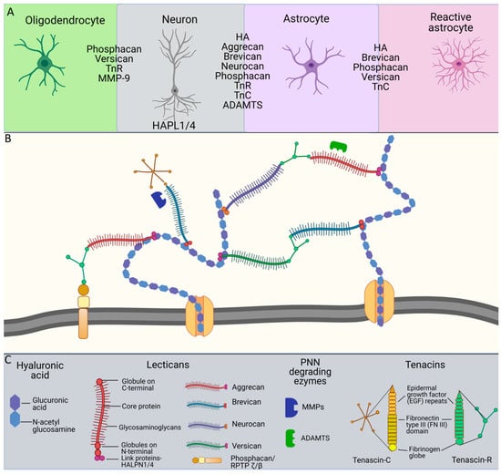 Scheme of perineuronal net structure and assembly. (A) Different cell types that are producing PNN components and associated regulatory molecules. (B) Schematic representation of the neuronal cell surface depicting a section of the simplified perineuronal net structure and its assembly, showing constituents and associated molecules. (C) Graphical representation of various molecular structures used in the above scheme. HA—hyaluronic acid; MMPs—matrix metalloproteinases; ADAMTS—a disintegrin and metalloproteinase with thrombospondin motifs; TA—tenascin assembly; EGF—epidermal growth factor; FN III—fibronectin type III (Created with Biorender.com).