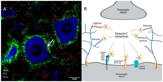 Besides HA and CSPG, other crucial molecules associated with PNN are members of the tenascin family, TnR and TnC. They differ in structural organization, TnR being a trimer and TnC presenting an assembly of two trimers bound through disulfide bonds to form a hexamer. On their N-terminals, TnC monomers contain the tenascin assembly domain consisting of heptad repeats, followed in sequence by epidermal growth factor (EGF) repeats, fibronectin type III (FN III) domains, and a fibrinogen globe at their C-terminal [34]. Its multidomain structure allows diverse interactions with the surrounding molecules in the ECM and PNN. Namely, TnC has been identified as a ligand for a variety of CSPG [35,36,37,38], and some sites of close proximity of TnC and WFA staining in PNN were observed as well (Figure 2A,B). Due to different binding of molecules to the TnC domains, its function can vary from adhesive to repulsive towards neurons, as developmentally regulated by alternative splicing [39]. In the neural tissue, TnC performs its functions mostly through the direct interaction with different cell surface receptors, including integrins, cell adhesion molecules and phosphacan/RPTP ζ/β [40,41,42,43]. However, TnC can act indirectly as well, through the modulation of other ECM components (Figure 2B).