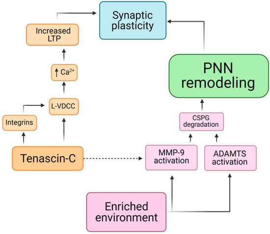 Hypothetical block diagram that illustrates the possible pathways of PNN remodeling towards synaptic plasticity and the role of enriched environment, including the involvement of tenascin C. LTP—long-term potentiation; L-VDCC-L—type voltage dependent Ca2+ channel; CSPG—chondroitin sulfate proteoglycans; MMP-9—matrix metalloproteinase 9; ADAMTS—a disintegrin and metalloproteinase with thrombospondin motifs. The dashed line indicates that direct evidence is still lacking (Created in Biorender.com).