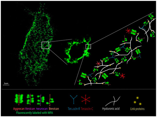 An original SIM image of PNN in the hippocampus (left), and an enlarged image window with a schematic representation of the main PNN constituents and associated molecules (enlisted in the bottom) and their simplified relations (right). The schematic representation emphasizes that only the lecticans, fluorescently labeled with WFA as the PNN marker, form the observable and analyzable PNN topography.