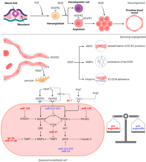 Subsequently to the generation of the vascular network, remodeling, pruning and maturation phenomena occur in order to form the functional adult circulatory system. In adult life, angiogenesis is restricted to wound healing, inflammation, and reproduction. In the absence of these triggers, ECs are maintained in a quiescent stage (Figure 1) by the balance between pro-angiogenic (VEGF, FGF, EGF, IFN, MMPs, ANGs) and anti-angiogenic (angioarrestin, angiostatin, IL-12, TSP-1, fibronectin fragment) factors. The network of these stimuli influences the local miRNAome and is also under the control of miRs. Therefore, in physiological conditions, the most abundant miRs in ECs are both pro-angiomiRs (miR-21, miR-126, let-7 family, miR-23, and miR-17-92 cluster) and anti-angiomiRs (miR-221, miR-222, and miR-24) [32].
