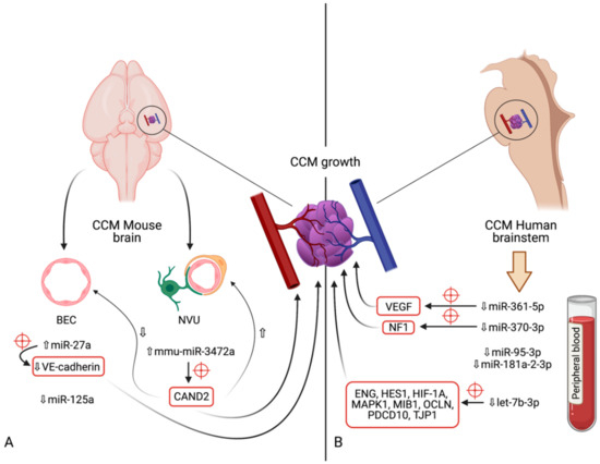 Diagram indicating the microRNAs and their respective expression levels, putative targets (marked by red crosshairs) and pathways involved in the development of cerebral cavernous malformations. The microRNAs are divided according to the model in which their expression was determined: (A)—mouse models (in vivo); (B)—human brainstem (according to the genome-wide association study by Kar et al. [97]). An upward pointing transparent arrow signifies upregulation; a downward pointing transparent arrow denotes downregulation. Abbreviations (in alphabetical order): BEC, brain endothelial cell; CAND2, cullin associated and neddylation dissociated 2; CCM, cerebral cavernous malformation; ENG, endoglin; HES1, Hes family bHLH transcription factor 1; HIF-1A; hypoxia inducible factor 1α; HMGA2, high-mobility group AT-hook 2; MAPK1, mitogen-activated protein kinase 1; MIB1, mindbomb E3 ubiquitin protein ligase 1; miR, microRNA; NVU, neurovascular unit; OCLN, occludin; PDCD10, programmed cell death 10; TJP1, tight junction protein 1; VE-cadherin, vascular endothelial cadherin.