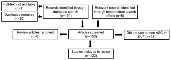 Duplicate articles identified using different subsets of keywords were removed from the original search results. Review articles were excluded from analysis as were articles that did not utilize human adipose-derived stromal/stem cells (hASC) or stromal vascular fraction (SVF) cells. As a note, SVF cells represent all other cell subtypes besides the mature adipocytes in adipose tissue, and contain endothelial progenitors, fibroblasts, lymphocytes, monocyte/macrophages, pericytes, pre-adipocytes, and stromal/stem cells, among others [7]. This collective population of cells is gaining increasing attention as we gain more insight into the contribution of adipose tissue cellular composition to overall structure and depot functionality, neuroendocrine function, viral response, and homeostasis regulation. Finally, articles were excluded if the full text could not be obtained beyond attempts of interlibrary sourcing within the US.