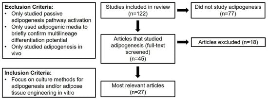 Articles that assessed adipogenesis were divided further according to the flow chart in Figure 4. The full texts of the 45 articles that studied adipogenesis were screened using the exclusion criteria outlined in Figure 4. Records were excluded if they exclusively studied passive adipogenesis pathway activation, if they only used adipogenic media to confirm multilineage differentiation potential, or if they exclusively studied adipogenesis in vivo. Many articles assessed the passive activation of adipogenic pathways to ensure that their culture conditions did not encourage spontaneous adipogenic differentiation. Additionally, many articles did not focus on adipogenesis but only used adipogenic media to demonstrate the multilineage differentiation potential of hASC. These articles were filtered to ensure that the data presented in this review reflect methods for intentional hASC adipogenesis and adipose tissue engineering in vitro. Finally, none of the screened articles exclusively studied 2D culture; therefore, all articles included in this analysis report 3D culture methods. Data and analysis hereafter exclusively refer to the 27 articles [4,5,8,9,10,11,12,13,15,16,17,19,20,21,22,23,24,25,26,28,30,31,33,38,44,45,48] identified to be most relevant to the central goal of this systematic review.