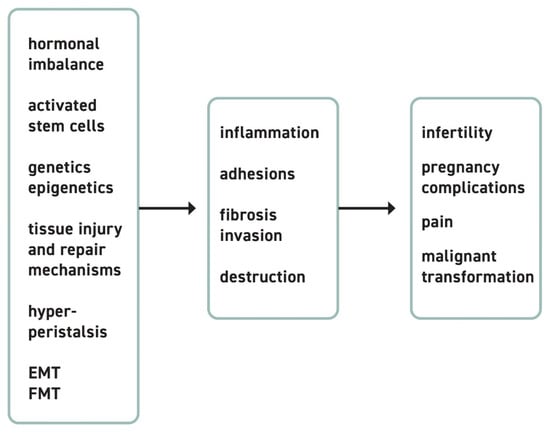 Pathophysiological pathways and clinical consequences. The underlying biological key concepts of EM include hormonal imbalance, activation of stem cells, changes on genetic and epigenetic levels, tissue injury and repair mechanisms, hyperperistalsis, epithelial-mesenchymal transition, and fibroblast to myofibroblast transition. In consequence, the formation of adhesions, fibrosis, inflammation, and local invasion arise. This coexistence of different pathways and their interactions triggers the clinical outcomes that affect multiple organ systems. EM patients present with complaints that include pain, infertility and sterility, complications in pregnancy, and even malignant transformation of preexisting lesions as ovarian cancer.