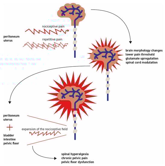 Physiologically, pain is a warning signal. Pain is an individual event, and the perception of pain is subjective. If severe dysmenorrhea (menstrual pain that leads to the need for bedrest or incapacity to go to school or to work without the use of analgesics) remains untreated, it will recur monthly. The pain is initially perceived cyclically, which subsides as the release of the inflammatory and pain mediators decreases. If this pain occurs repeatedly, however, the body’s warning signals take effect, and it is classified as threatening. Now, the modulation at the spinal level does not regulate it down but rather increases it. The release of neurotransmitters is altered (glutamate upregulation), and several modulating mechanisms are set in motion: the nociceptive field is expanded and dysuria and/or dyschezia may occur [46]. These processes lead to spinal hyperalgesia marked by a lowered pain threshold and the perception of pain, even with slight stimuli such as touch. Increasing pain frightens the person experiencing it and makes pain processing more difficult. Severe cramps, accompanied by vegetative reactions, lead the patient to adopt a relieving posture, which is used to seek pain relief. Reactively, this leads to a reflex contraction of the pelvic floor muscles and eventually to pelvic floor dysfunction. This increases the experienced pain and is known to lead to dyspareunia [47]. If these tensions persist, dyspareunia intensifies. Fear of pain during intercourse can strongly influence the ability to relax and a disorder manifests itself. Figure 2 illustrates the process of spinal hyperalgesia. Changes at the central level develop. Functional MRI assessments demonstrated the first morphological adjustments of the brain after a pain latency of two years [48]. Patients suffering from chronic pain have an increased risk of developing complex chronic pain syndromes with bladder dysfunction, irritable bowel syndrome, and vulvodynia [46]. This explains the often severe pain that accompanies patients, even in the absence of pathological findings. Patients are increasingly desperate and look for advice and help but are rarely understood [49]. It is essential to offer pain relief therapy. Pain medication to relieve nociceptive pains (mostly NSAIDs) is widely used. In complex cases, a more differentiated approach is needed, including the use of opioids for severe pain as well as medication that modulates neurotransmitter levels (e.g., gabapentin and pregabalin) in patients with chronic pain disorders. Moreover, physiotherapy or psychosomatic therapy may help in the search for pain relief. Taken together, the pathogenesis of EM-associated pain is very complex and certainly not yet fully understood.