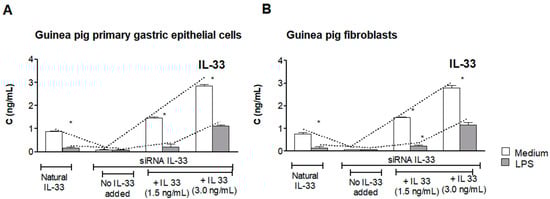 The concentration of IL-33 in cell culture supernatants. The level of IL-33 was assessed in cell cultures of guinea pig-derived primary gastric epithelial cells (A) or fibroblasts (B). Cells not transfected or transfected with siRNA IL-33 were used. Cells were sub-cultured with or without H. pylori lipopolysaccharide (LPS), 25 ng/mL, in the presence or absence of exogenous IL-33 (1.5 or 3.0 ng/mL). The concentration of IL-33 was estimated after 24 h in cell culture supernatants by the enzyme-linked immunosorbent assay (ELISA). Results are shown as median with the range of five experiments performed in triplicate for each experimental variant. Statistical analysis was performed using the nonparametric Mann-Whitney U test with significance at p < 0.05 * unstimulated vs. LPS H. pylori stimulated cells.