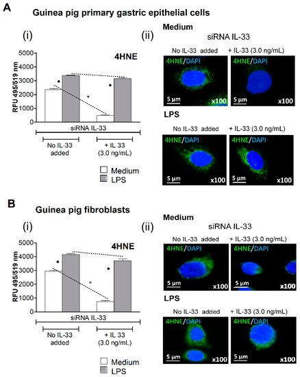 Oxidative stress assessment. The oxidative stress intensity was assessed on the basis of the relative fluorescence of 4-hydroxy-2-nonenal (4HNE), detected by immune staining with anti-4HNE antibodies. Primary gastric epithelial cells (A) or fibroblasts (B), transfected with siRNA IL-33, not exposed or exposed to H. pylori lipopolysaccharide (LPS), 25 ng/mL, in the presence or absence of exogenous IL-33 (3.0 ng/mL), were assessed for 4HNE. (i) Fluorescence intensity of 4HNE in gastric epithelial cells or fibroblasts was measured using the ImageJ software version 1.48v (National Institute of Health, United States). (ii) Representative images of primary gastric epithelial cells or fibroblasts stained for 4HNE and photographed with a fluorescence microscope (Axio Scope A1, Zeiss, Germany) are shown. Cells were treated with 4′,6-diamidino-2-phenylindole (DAPI), for nuclear staining. Results are shown as median with the range of five experiments performed in triplicate for each experimental variant. Statistical analysis was performed using the nonparametric Mann-Whitney U test with significance at p < 0.05. * cells not treated with LPS H. pylori, in medium without IL-33 vs. cells not exposed to LPS H. pylori, in medium with IL-33; ● cells not treated with LPS H. pylori vs. cells treated with LPS H. pylori, in medium without or with IL-33.