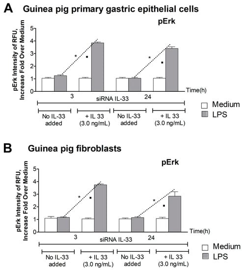 The Erk signaling pathway is involved in the positive or negative regulation of different cell activities, including cell growth, differentiation, metabolism, and cell migration, which are initiated in cells in response to various bacterial stimuli or stress conditions [45]. In this study, we estimated the level of phosphorylated Erk (pErk) in siRNA IL-33 transfected cells that were either unexposed or had been exposed to LPS H. pylori in medium alone or enriched with exogenous IL-33. The responsiveness of siRNA IL-33 transfected gastric epithelial cells and fibroblasts to LPS H. pylori was significantly diminished, so the amount of activated pErk was on the level of medium (Figure 3A,B). However, the subculturing cells with exogenous IL-33 caused an upregulation of cell responsiveness to LPS H. pylori to a level approximately four times higher than the medium (Figure 3A,B). In the study, we tested Erk activation after 3 h and 24 h of cell stimulation. The level of phosphorylated Erk in both cell types after 24 h of exposure to LPS H. pylori was still high, suggesting the direct involvement of pErk signal protein in the regulation of IL-33- dependent cell activities.
