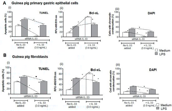 Assessment of apoptosis. Cell apoptosis was estimated by terminal deoxynucleotidyl transferase (TdT)-mediated dUTP nick end labeling (TUNEL) assay (i), assessment of expression of anti-apoptotic Bcl-xL protein by using anti-Bcl-xL primary antibodies and secondary antibodies conjugated with isothiocyanate fluorescein (FITC) (ii), and 4′,6-diamino-2-phenylindole (DAPI) nuclear staining (iii). The results for the guinea pig primary gastric epithelial cells (A) or fibroblasts (B), transfected with siRNA IL-33, which were not treated or treated with H. pylori lipopolysaccharide (LPS), 25 ng/mL, in the culture medium without or with IL-33 (3.0 ng/mL), are presented. The cell fluorescence was measured using a fluorescence reader (Victor2, Wallac, Oy Turku, Finland) at appropriate wavelengths: 495 excitation and 519 emission for FITC, 550 nm excitation and 590 nm emission for TUNEL, and 345 nm excitation and 455 nm emission for DAPI. Results are shown as median with the range of five experiments performed in triplicate for each experimental variant. Statistical analysis was performed using the nonparametric Mann-Whitney U test with significance at p < 0.05. *cells in medium without IL-33 vs. cells in medium with IL-33, not treated with LPS H. pylori; ● cells treated with LPS H. pylori, in medium without IL-33 vs. cells treated with LPS in medium with IL-33; ▪ cells not treated with LPS H. pylori vs. cells treated with LPS H. pylori, in medium without or with IL-33.