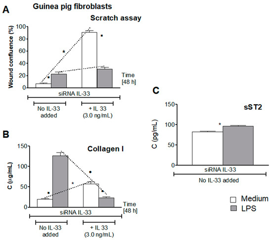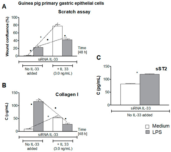 Pro-regenerative activity of guinea pig fibroblasts. Cells transfected with siRNA IL-33, which were not exposed or exposed to lipopolysaccharide (LPS) H. pylori in medium without or with IL-33 3.0 ng/mL, were used. Cell monolayers were scratched and then the cells’ ability to migrate was assessed (A). Cell culture supernatants were used for assessment of collagen I concentration (B) by the enzyme-linked immunosorbent assay (ELISA). Furthermore, the level of soluble ST2 (sST2) was assessed by the ELISA in cell cultures of siRNA IL-33 transfected cells not exposed or exposed to LPS H. pylori (C). Results are shown as median with the range of five experiments performed in triplicate for each experimental variant. Statistical analysis was performed using the nonparametric Mann-Whitney U test with significance of p < 0.05. * cells in medium without IL-33 vs. cells in medium with IL-33, not treated with LPS H. pylori; ● cells treated with LPS H. pylori, in medium without IL-33 vs. cells treated with LPS in medium with IL-33; ▪ cells not treated with LPS H. pylori vs. cells treated with LPS H. pylori, in medium without or with IL-33.