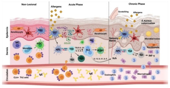 AD is a multifactorial complex disease, so a discrete and definite pathomechanism is still missing. A complex interplay among a disrupted epidermal barrier, itch, skin inflammation, and immune dysregulation along with genetic and environmental factors contribute towards the onset, progression, and chronicity of AD []. However, it is not yet clear if epidermal dysfunction precedes immune dysregulation or vice versa. Two theories, namely “inside-out” vs. “outside-in”, have been proposed but remain controversial []. The outside-in theory hypothesizes that the inherent damage to the skin barrier function due to disturbed keratinocyte differentiation facilitates the entry of allergens and subsequent immune system activation. On the other hand, the inside-out theory hypothesizes that the immunological cascade that happens as a result of Th2 activation in the skin leads to the AD phenotype []. Hence, AD is considered as a biphasic T cell-mediated disease where the acute phase is dominated by Th2 signaling, while a subsequent switch from Th2 to Th1 signaling results in a chronic state of the disease []. Th22 cells contribute in maintaining the chronic state of AD with more intense infiltration of T cells, “resident” (CD1c+) dendritic cells, and myeloid (CD11c+) dendritic cells compared to the acute phase of AD [].
