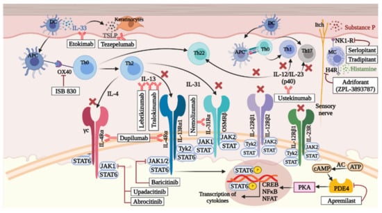 Dendritic cells (DCs) in AD: Dendritic cells are a well-defined subset of immune cells specialized in antigen uptake and presentation with a vigorous distribution of various DC subsets during different phases of inflammation []. There are two important subsets of DCs in the context of AD that show variable expression of different surface markers. One subset is Langerhans cells (LC) CD127+ (Langerin+), CD1a+, and FcεRI+, while the other is dermal dendritic cells CD1c+, CD11c+, and FcεRI+. Under inflammatory conditions, another subset develops known as inflammatory dendritic epidermal cells (IDECs) CD1a+ CD206+. The continuous replenishment of these subsets dependents on the monocytes and recirculating blood pre-DCs []. IDECs play a major role in the development of AD, and inhibition of their activation is a focal point of current therapeutics. Jak kinases are important for the development of DCs, and the inhibition of JAK1/JAK2 has been shown to disrupt the development of IDECs from monocytes []. The DCs with high-affinity IgE receptors (FcεRI+) in AD skin are important for initiating the immune response to protein antigens entering the epidermis [,]. Plasmacytoid DCs are completely depleted in AD patients due to Th2 cytokine-mediated apoptosis leading to eczema herpeticum susceptibility in AD patients [,,]. Hence, different subsets of DCs play a role during different phases of the disease.