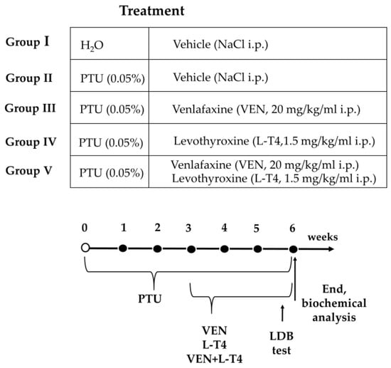 The following agents and drugs were used: propylthiouracil (PTU; 0.05%; Sigma-Aldrich, Saint Louis, MO, USA), venlafaxine (VEN, 20 mg/kg/mL; Carbosynth, Compton, UK), and levothyroxine sodium salt pentahydrate (L-T4, equal to 1.5 mg/kg/mL levothyroxine; Sigma-Aldrich, Saint Louis, MO, USA).