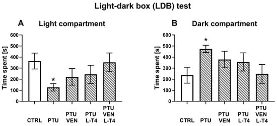 Effects of propylthiouracil (PTU) in Wistar Kyoto (WKY) rats and venlafaxine (VEN), levothyroxine (L-T4), and VEN + L-T4 administration on time spent in the light compartment (A) and the dark compartment (B) measured in the light-dark box test in PTU-treated WKY rats. The results are expressed as the mean ± SEM. * p < 0.05 vs. the WKY (control group). n = 8–10. Statistics: one-way/factorial analysis of variance (ANOVA), post hoc comparison: Duncan test, when appropriate.