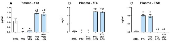 Effects of propylthiouracil (PTU) in Wistar Kyoto (WKY) rats and venlafaxine (VEN), levothyroxine (L-T4), and VEN + L-T4 administration on fT3 (A), fT4 (B), and TSH (C) levels in plasma in PTU-treated WKY rats. The results are expressed as the mean ± SEM. * p < 0.05 vs. the WKY (control group); # p < 0.05 vs. the WKY + PTU (coexisting depression and hypothyroidism group). n = 9–12. Statistics: one-way/factorial analysis of variance (ANOVA), post hoc comparison: Duncan test, when appropriate.