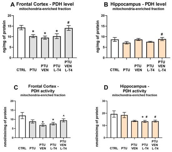 Effects of propylthiouracil (PTU) in Wistar Kyoto (WKY) rats and venlafaxine (VEN), levothyroxine (L-T4), and VEN + L-T4 administration on pyruvate dehydrogenase (PDH) levels and activity in the mitochondria-enriched fraction of the frontal cortex (A,C) and the hippocampus (B,D) in PTU-treated WKY rats. The results are expressed as the mean ± SEM. * p < 0.05 vs. the WKY (control group); # p < 0.05 vs. the WKY + PTU (coexisting depression and hypothyroidism group); ^ vs. the WKU + PTU + VEN group. n = 8–10. Statistics: one-way/factorial analysis of variance (ANOVA), post hoc comparison: Duncan test, when appropriate.