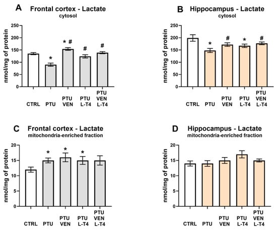 Effects of propylthiouracil (PTU) in Wistar Kyoto (WKY) rats and venlafaxine (VEN), levothyroxine (L-T4), and VEN + L-T4 administration on lactate levels in the cytosolic and mitochondria-enriched fraction of the frontal cortex (A,C) and the hippocampus (B,D) in PTU-treated WKY rats. The results are expressed as the mean ± SEM. * p < 0.05 vs. the WKY (control group); # p < 0.05 vs. the WKY + PTU (coexisting depression and hypothyroidism group). n = 7–8. Statistics: one-way/factorial analysis of variance (ANOVA), post hoc comparison: Duncan test, when appropriate.