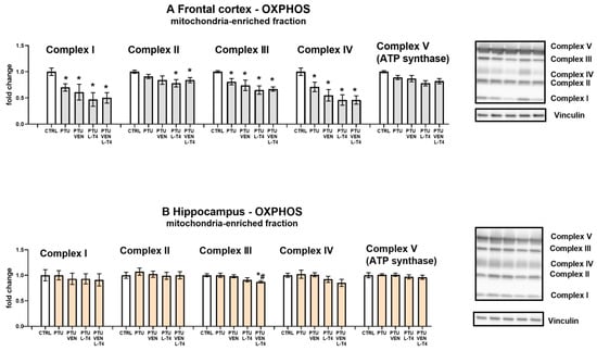 Effects of propylthiouracil (PTU) in Wistar Kyoto (WKY) rats and venlafaxine (VEN), levothyroxine (L-T4), and VEN + L-T4 administration on oxidative phosphorylation (OXPHOS) complexes in the mitochondria-enriched fraction of the frontal cortex (A) and the hippocampus (B) in PTU-treated WKY rats. The bands from the left: WKY, WKY + PTU, WKY + PTU + VEN, WKY + PTU + L-T4, and WKY + PTU + VEN + L-T4. The results are expressed as the mean ± SEM. * p < 0.05 vs. the WKY (control group); # p < 0.05 vs. the WKY + PTU (coexisting depression and hypothyroidism group). n = 8. Statistics: one-way/factorial analysis of variance (ANOVA), post hoc comparison: Duncan test, when appropriate (See Supplementary Materials).