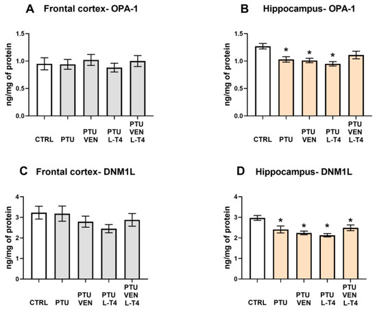 Effects of propylthiouracil (PTU) in Wistar Kyoto (WKY) rats and venlafaxine (VEN), levothyroxine (L-T4), and VEN + L-T4 administration on OPA-1 and DNML1 in tissue homogenates of the frontal cortex (A,C) and the hippocampus (B,D) in PTU-treated WKY rats. The results are expressed as the mean ± SEM. * p < 0.05 vs. the WKY (control group). n = 9–10. Statistics: one-way/factorial analysis of variance (ANOVA), post hoc comparison: Duncan test, when appropriate.