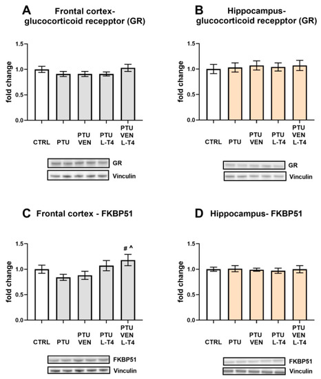 Effects of propylthiouracil (PTU) in Wistar Kyoto (WKY) rats and venlafaxine (VEN), levothyroxine (L-T4), and VEN + L-T4 administration on glucocorticoid receptor (GR) and FKBP51 in tissue homogenates of the frontal cortex (A,C) and the hippocampus (B,D) in PTU-treated WKY rats. The bands from the left: WKY, WKY + PTU, WKY + PTU + VEN, WKY + PTU + L-T4, and WKY + PTU + VEN + L-T4. The results are expressed as the mean ± SEM. # p < 0.05 vs. the WKY + PTU (coexisting depression and hypothyroidism group); ^ vs. the WKU + PTU + VEN group. n = 8. Statistics: one-way/factorial analysis of variance (ANOVA), post hoc comparison: Duncan test, when appropriate (See Supplementary Materials).