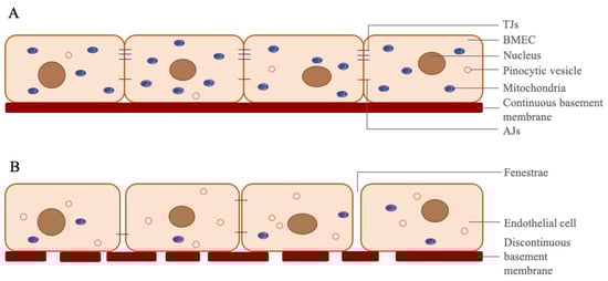 Endothelial cells are found in all vascular structures in the body and line the luminal surface of the vessel. Their main function is to regulate the transmission of molecules in the bloodstream to the surrounding tissues. BMECs are the most important component of the BBB barrier structure. They have many differences (e.g., fewer pinocytotic vesicles and fenestrae, more mitochondria and cell–cell junction proteins) from the peripheral endothelial cells [,,]. All these differences ensure that paracellular and transcellular permeability from BMECs is lower than that of microvascular endothelial cells in the periphery.