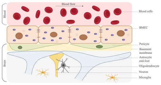 Schematic representation of the blood–brain barrier and the supportive cell types on the barrier function. BMECs form the lining of the brain microvasculature and they interact with multiple cells. Brain microvascular pericytes are embedded in the basal membrane and astrocytic end-feet surround brain micro vessels. Neurons, oligodendrocytes and microglia are also found in perivascular space. Created with BioRender.com (accessed on 21 May 2021).