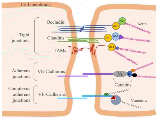 BMECs carry out the regulation of permeability through TJs and AJs. TJs located in the apical end of the lateral side of BMECs can even limit the passage of soluble substances by tightly connecting two neighboring cells like a zipper []. Proteins involved in the structure of TJs are divided into two, as transmembrane and cytoplasmic proteins. The transmembrane proteins occludin, claudins and junction adhesion proteins (JAMs) interact with cytoplasmic scaffolding proteins, which are Zonula Occludens 1–2 and 3 (ZO-1/2/3), members of membrane-associated guanylate kinase (MAGUK) protein family, actin cytoskeleton and associated proteins (Figure 3) [,,].