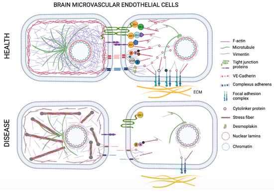 Schematic representation of the cytoskeleton and the interactions of transmembrane proteins with cytoskeleton proteins and the nucleus in brain microvascular endothelial cells (BMECs) in health and disease. In healthy conditions cortical actin ring supports and stabilizes the cell membrane outward. Cytoskeleton and cortical actin ring join cell–cell and cell–matrix adhesion complexes. Microtubules interact with actin directly or indirectly through intermediate filament proteins or signal molecules. Vimentin intermediate filament provides structural support and mechanical integrity to the cells. Transmembrane tight junction proteins, adherens junction and complexus adherens proteins associate and bind to each other across the intercellular cleft. These proteins link to the cell cytoskeleton directly or via cytolinker proteins. In disease conditions vimentin network is destroyed, the cell loses actin organization, and stress fibers increase in endothelial cells creating higher contractility. The adhesion complex structure reorganizes, and because of the loosening of cell–cell and cell–matrix junctions, gaps occur in the intercellular connections. Cells pull out from each other and barrier permeability increases. Created with BioRender.com (accessed on 21 May 2021).