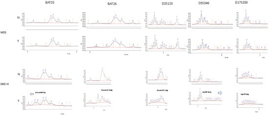 - Bacher, J.W.; Flanagan, L.A.; Smalley, R.L.; Nassif, N.A.; Burgart, L.J.; Halberg, R.B.; Megid, W.M.; Thibodeau, S.N. Development of a fluorescent multiplex assay for detection of MSI-High tumors. Dis. Markers 2004, 20, 237–250. [Google Scholar] [CrossRef]