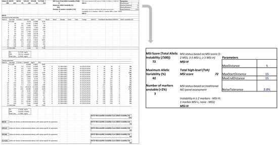 Automatic computation methods for MSI status determination based on allelic instability using both a traditional assessment of NCI panel (0/1/≥2 markers unstable corresponding to MSS/MSI-L and MSI-H respectively) and an MSI scoring system (total allelic variability 1–2/3–5/>5 corresponding to MSS/MSI-L and MSI-H). This tumour specimen was considered MSI-H with a Total high-level (Toh) MSI score of 72.