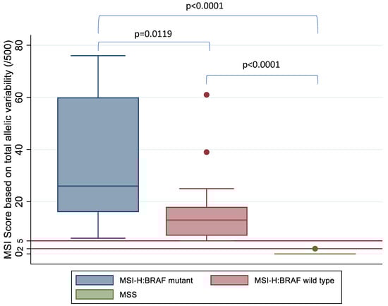 MSI score based on allelic instability (/500) by MSI and BRAF status confirmed on IHC and high-resolution capillary electrophoresis. Kruskal–Wallis test shows a statistically significant difference between the three subgroups based on MSI status. Horizontal red lines mark the tiers between MSS, MSI-L and MSI-H based on MSI score.